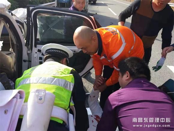 事发在当天下午14时许,一辆号牌为赣A6567J的小轿车因驾驶员疲劳驾驶导致了这场追尾事故,车上仅有驾驶员一人,轿车被撞毁并且车内安全气囊全部弹出,轿车驾驶员当场昏迷。被追尾货车驾驶员把车辆停靠在应急车道上立即拨打报警电话和120急救求助,同时,南昌南管理中心邓家养护站接到出勤电话,得知事故发生后,养护站员工周宇迅速出动,10余分钟抵达事故现场,他迅速摆放警示标志牌,指挥引导过往车辆安全通行,一边与高速交警展开了一场生死救援。