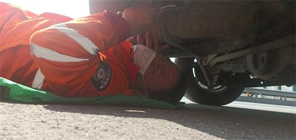 经询问,该车车主正赶往浙江复工,行至此处车辆右后轮胎突然爆胎,虽然车上有备用轮胎,但因没有换轮胎经验,不知如何使用换胎工具。