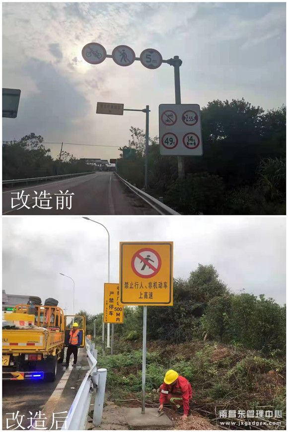 对此,樟树东收费所在对安全工作调研中发现所属各站的“禁止行人和非机动车上高速禁止”标识距离地面过远,过往司乘及沿线市民往往无法及时发现此标识,该所联合新干北养护站在所各站收费广场入口前的醒目位置加装了一个写有“禁止行人、非机动车辆上高速”的禁止标识,切实将风险隐患消灭在萌芽状态。
