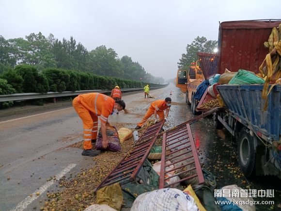 当天凌晨4时许,玉山中队值班人员接到报警电话,在K486上海方向发生一起追尾事故,导致吴师傅所驾驶的后方货车侧翻在地,所载10多吨的药用金桔散落一地。10多分钟后,该中队伍救援人员火速赶到事故现场,进行现场安全围蔽及检查,所幸吴师傅只是轻微受伤,但是情绪有些激动。随后,他们安抚了吴师傅的情绪,并立刻打扫和清理翻倒在地的金桔,20分钟后,他们快速地清理出超车道,让后方车辆缓慢通行。