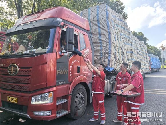 志愿者们一边将切好的西瓜递给司乘人员,一边亲切地叮嘱:“师傅,天气太热了,注意防暑降温,开车累了就多休息会儿。” 对于长时间驾驶、面露疲惫的司机,志愿者们还会温馨地提醒他们高温天气下车辆保养和行车安全的注意事项,确保他们能够安全抵达目的地。